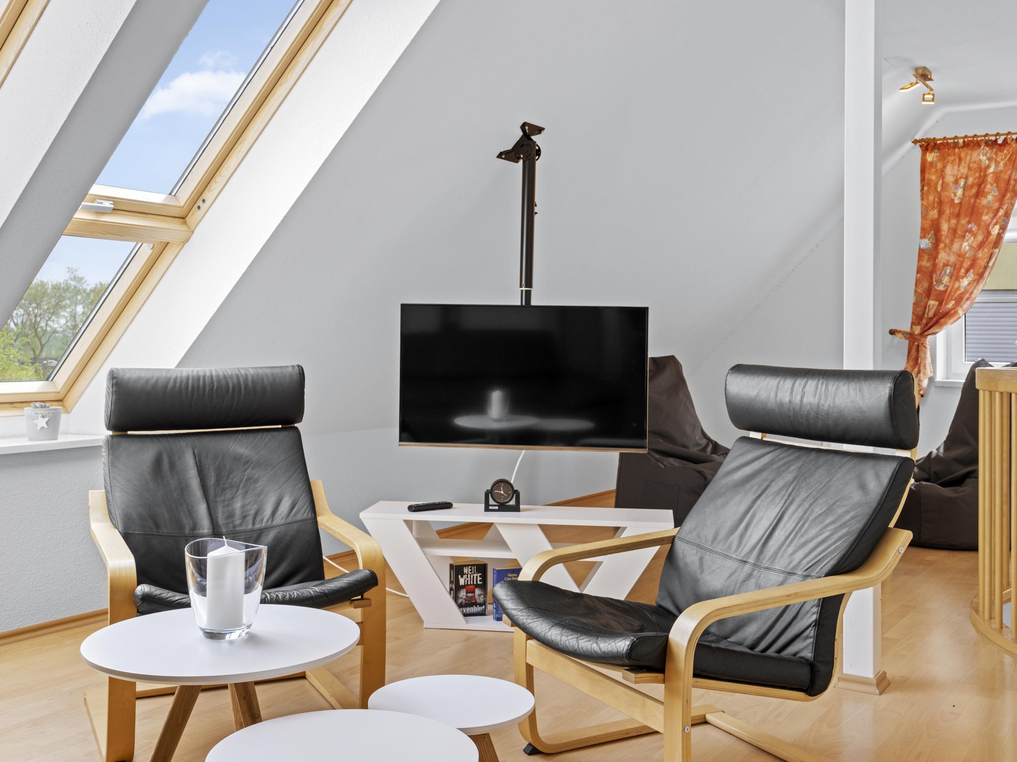 Op de 1e etage: woonkamer met TV(flatscreen), zithoek, stereo-installatie, gezelschapsspellen , slaapkamer met 2-pers. bed(2 persoons dekbed, 180 x 200 cm) , slaapkamer met 2x 1-pers. bed , badkamer met spa bad, douche, sauna, wastafel, wc
