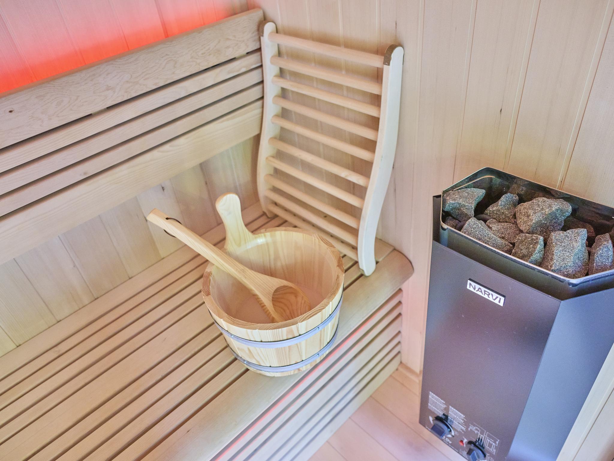 berging(wasdroger, wasmachine), sauna(privé), airconditioning, terras(privé), tuin(privé), tuinmeubilair, 3x parking, ligstoelen, strijkplank, strijkijzer